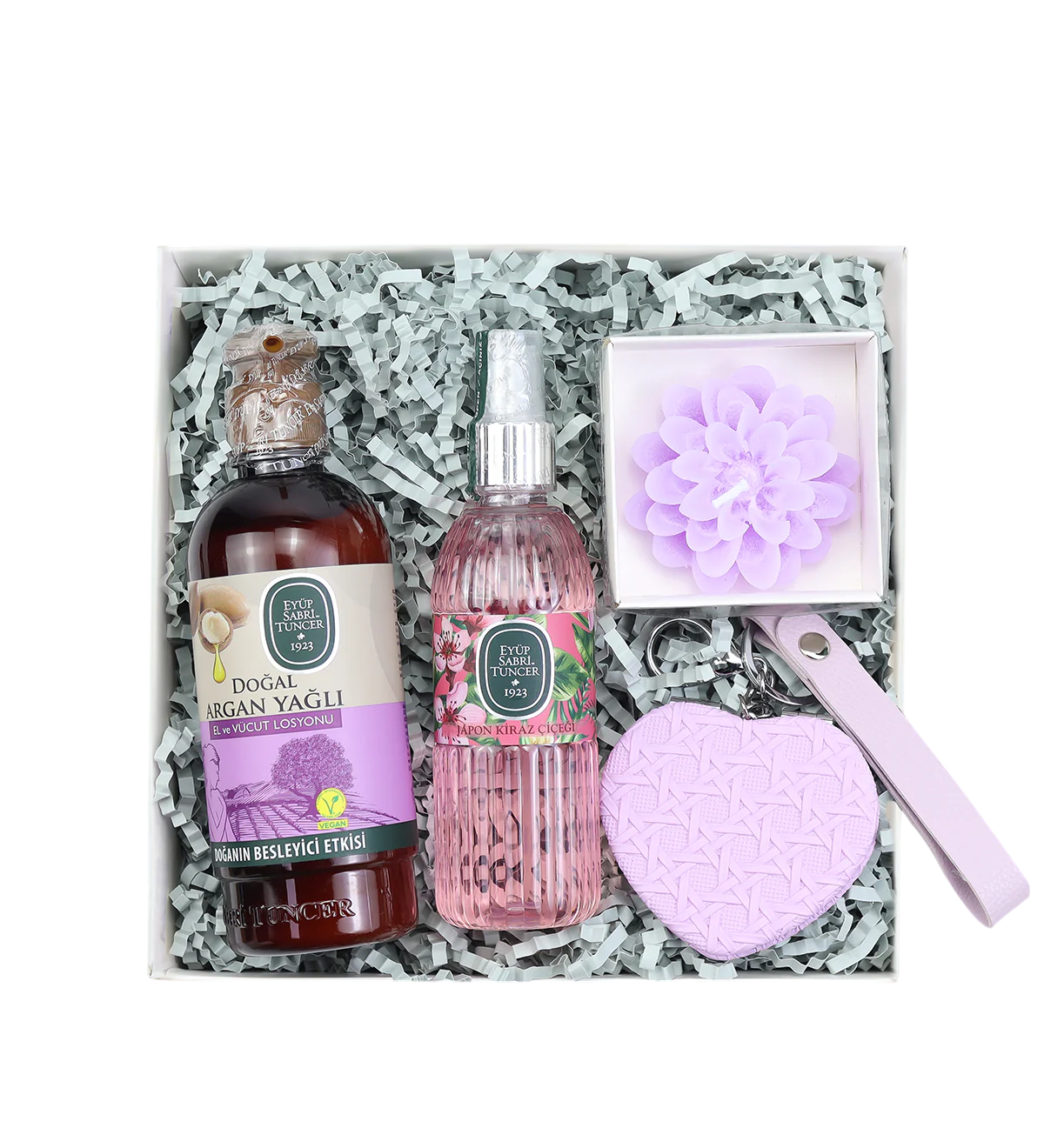 1 AdetLotus Mum & 1 Adet Kalp Ayna & 1 Adet 150ML Eyüp Sabri Tuncer Sprey Kolonya & 1 Adet Eyüp Sabri Tuncer Doğal Argan Yağlı El ve Vücut Losyonu