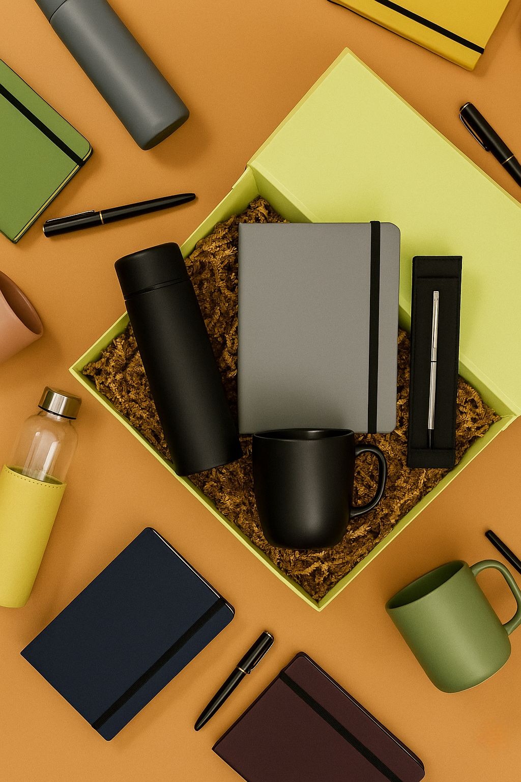 Pratik Ürünler: Şık ajandalar, kalemler, termoslar veya özel tasarımlı kupalar gibi günlük yaşamda kullanılabilecek ürünlerle zenginleştirilmiş kutular.